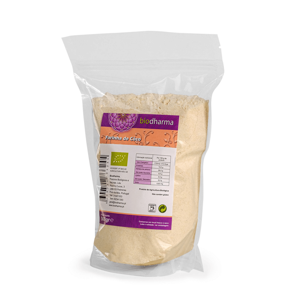 A farinha de coco é produzida a partir de frutos provenientes da agricultura biológica.