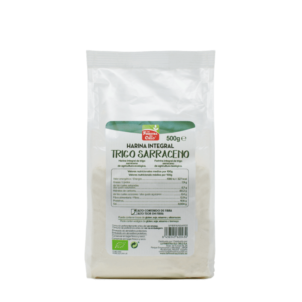 Farinha de trigo sarraceno integral de agricultura biológica e embalada numa atmosfera protetora.