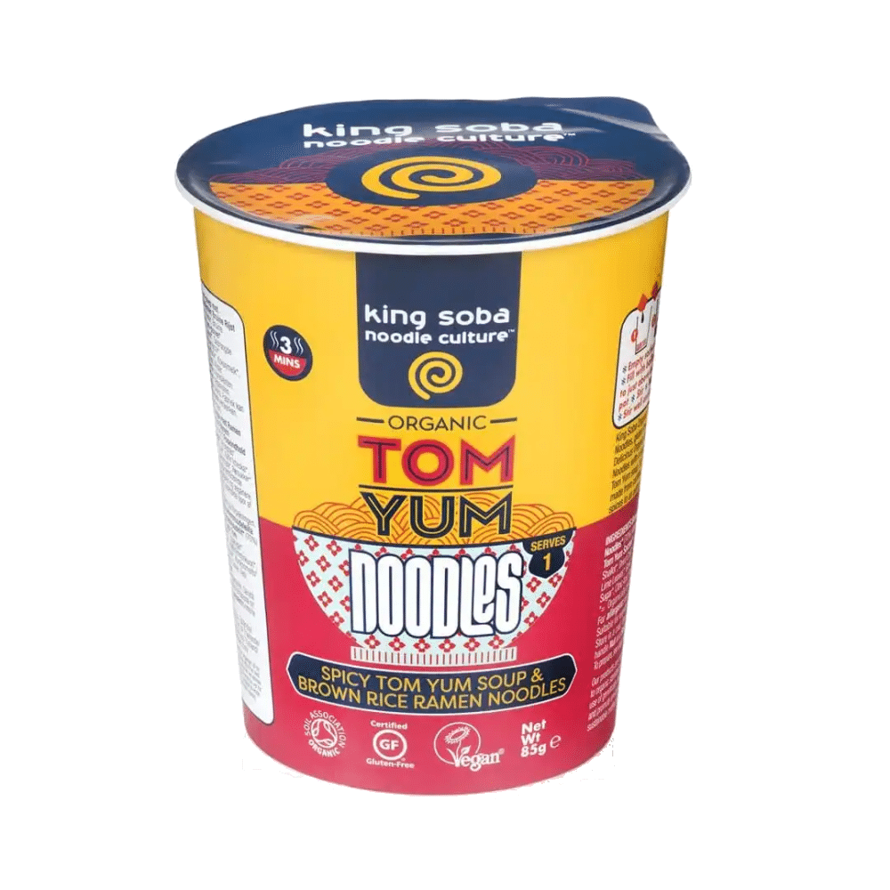 Sopa Tom Yum com Ramen Noodles, da King Soba, sem glúten e pronta em minutos. Deliciosos noodles Ramen de Arroz Integral Biológico com uma sopa picante, doce e azeda de Tom Yum. A nossa sopa Tom Yum é feita de ervas e especiarias biológicas certificadas numa receita tailandesa autêntica.