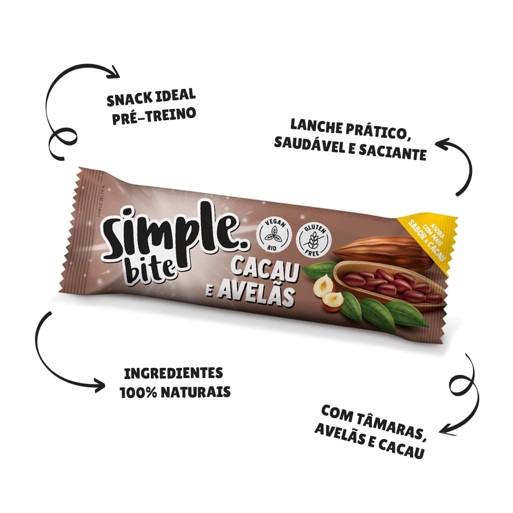 Para os grandes fãs de cacau com avelã, mantendo o sabor e características de um snack cru de fruta e frutos secos, as Barras Simple®️ Bite Cacau e Avelãs são de provar e querer muito mais!