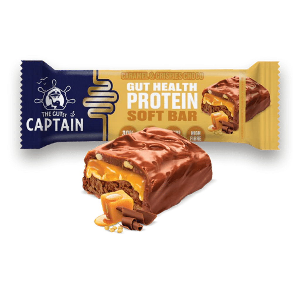 Barra proteica para a saúde intestinal**, com chocolate e caramelo e com uma camada de pepitas de soja crocantes, com textura suave. Teor de chocolate 26% Teor de caramelo 8%.