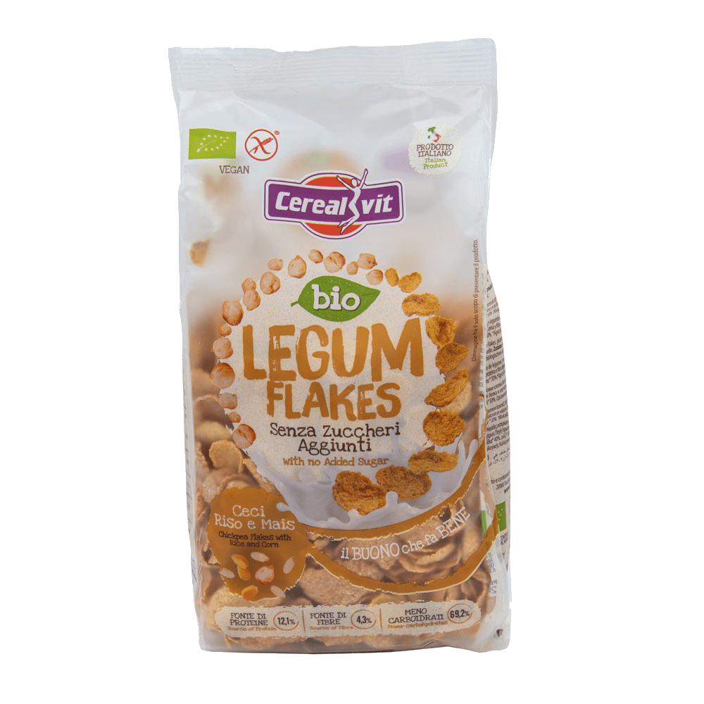Flocos de legumes, sem glúten e sem adição de açúcares. Fonte de proteína e fibra.