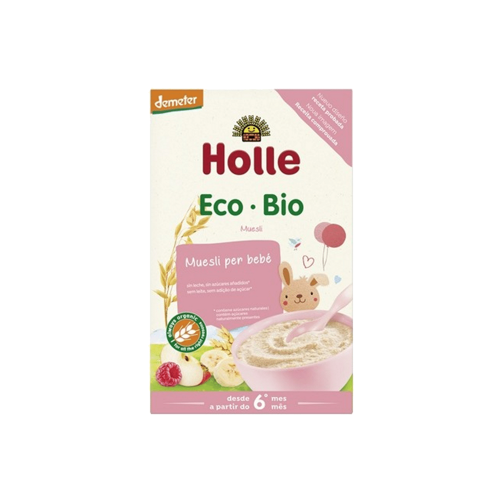 Muesli de cereais e fruta: Mistura 2 colheres de sopa de flocos de muesli com 100 g de boião de fruta da Holle e 1 colher de chá de óleo complementar para bebés da Holle e junta água na quantidade necessária.