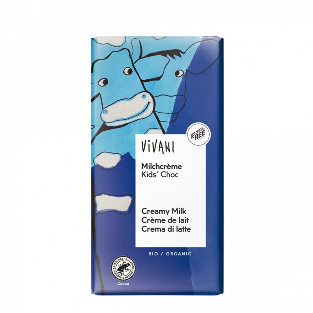 O primeiro chocolate orgânico para crianças, com um recheio tenro de creme de leite, coberto com chocolate de leite fino.