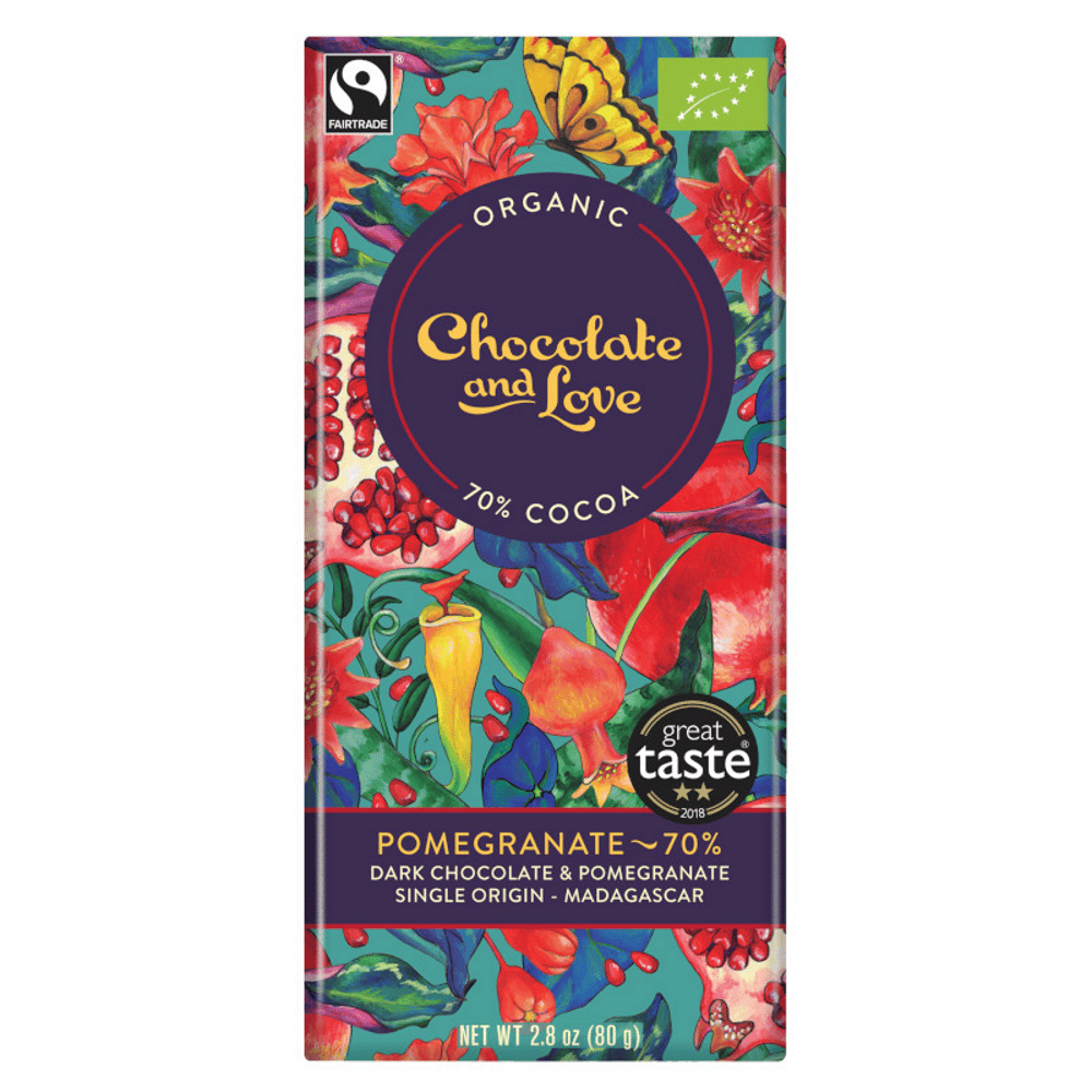 Pasta de cacau *, açúcar de cana *, manteiga de cacau *, preparado de romã * 9% (romã *, sumo de maçã concentrado*, farinha de arroz*, espessante* [pectina *]), vagem de baunilha*.
