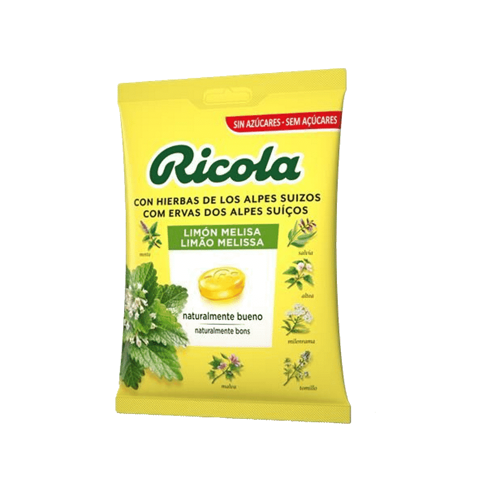 Edulcorante (isomalte), acidificante (ácido cítrico), extrato (0,3%) de melissa e da mistura de ervas aromáticas Ricola, aroma natural de citrinos, concentrado (cenoura), edulcorantes (glicosideos de esteviol, taumatina), óleos essenciais de menta e de mentol.