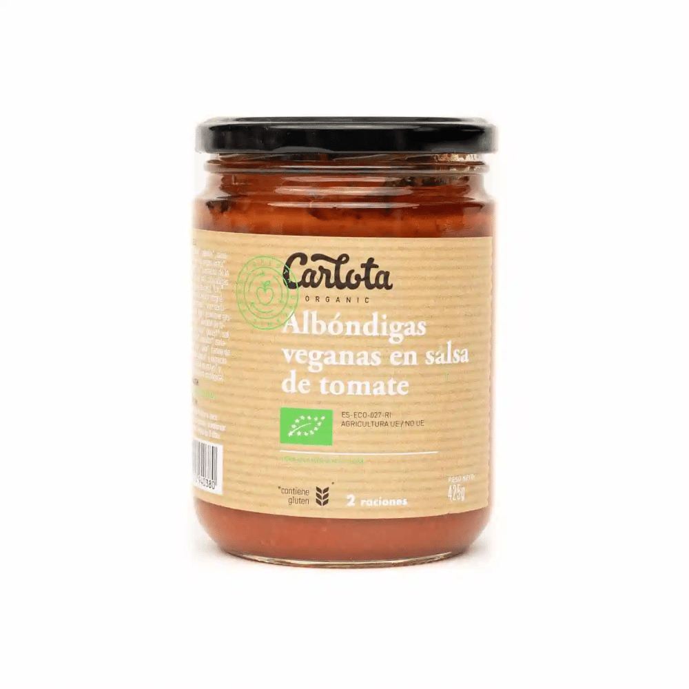 Molho (75%) [Tomate (88%)*, cebola*, cenoura*, azeite extra virgem *, açúcar de cana *, alho*, sal], almôndegas (25%) [Okara* (polpa de SOJA), Tofu* [água, SOJA e nigari (cloreto de magnésio)], óleo de girassol*, SOJA texturizada*, GLÚTEN de trigo* (contém GLÚTEN), arroz integral*, amido de tapioca*, AVEIA em flocos*, salsa*, sal, alho*, caldo de vegetais* (cebola*, cenoura*, alho francês*, alho*, farinha de arroz*, sal, óleo de girassol* e extrato de fermento*), cebola em pó* e alfarroba*]. (*de agricultura biológica UE/Não UE) Totalmente livre de álcool 0%