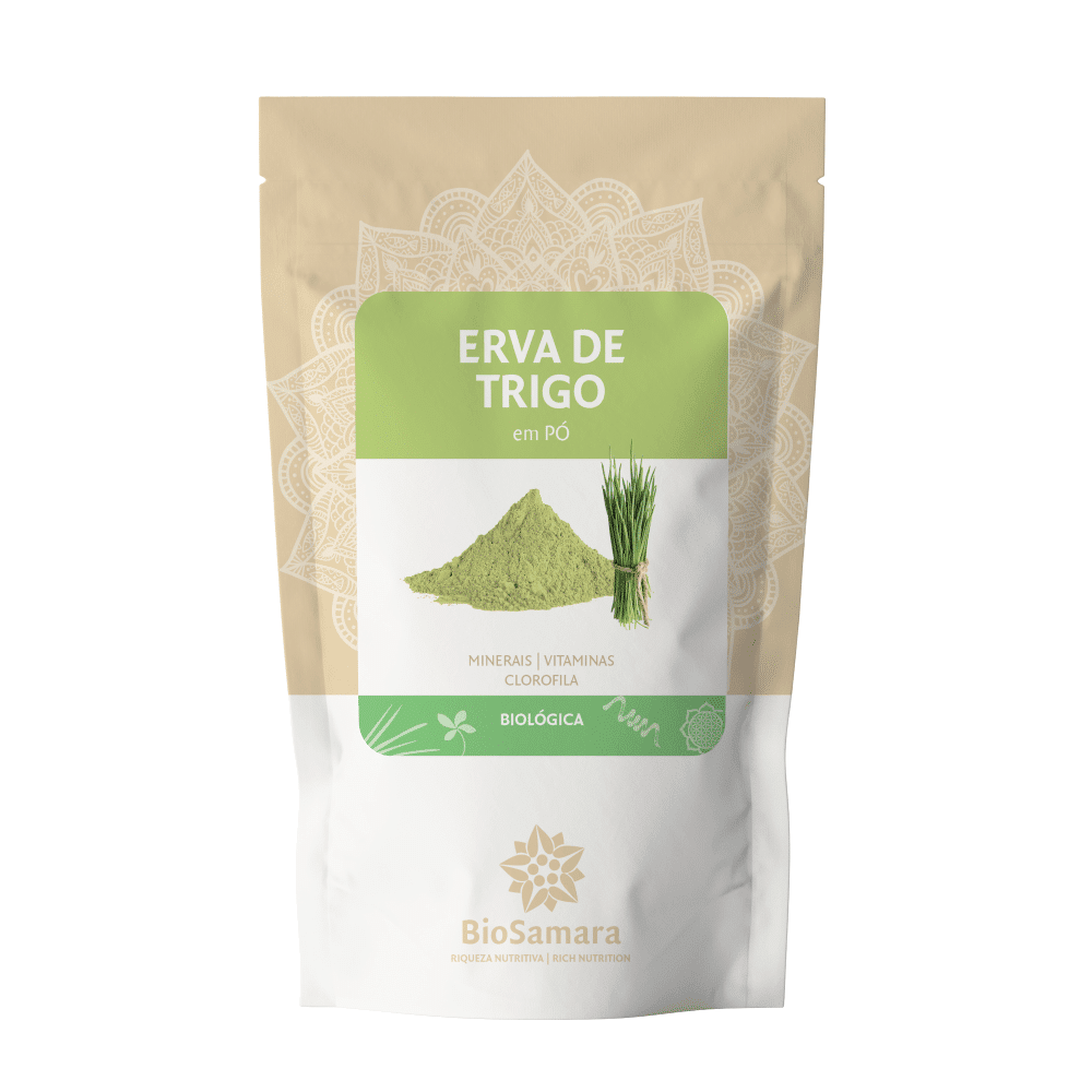 Erva de Trigo em Pó, clorofila, ferro, sais minerais como cálcio, fósforo, potássio, ferro, zinco, magnésio, manganês, selênio, sílica, cobre e boro
