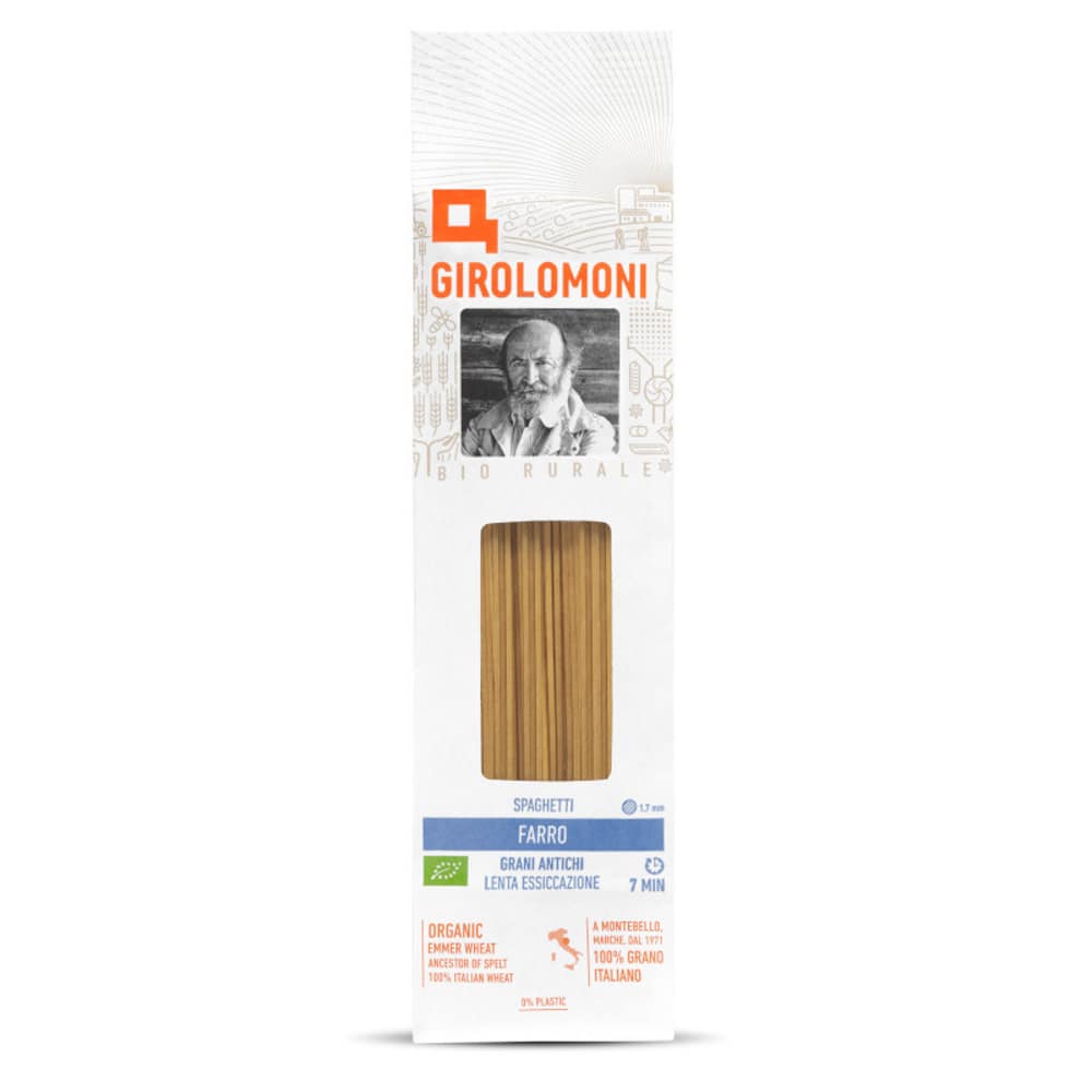 Esta massa altamente digerível é produzida usando apenas espelta triticum dicoccum minuciosamente selecionado e cultivada pelos sócios membros da Girolomoni nas colinas da Úmbria e Marcas, usando métodos estritamente biológicos.