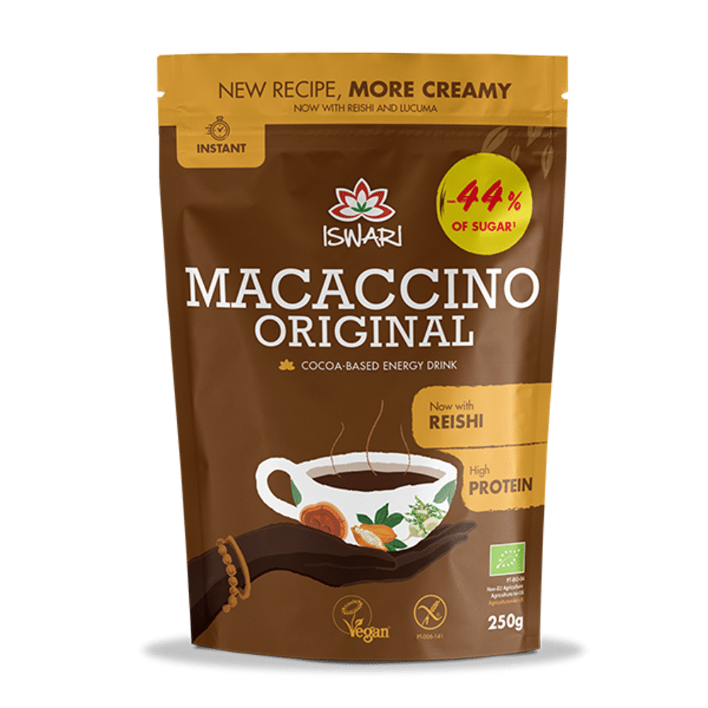 Esta mistura é uma ótima aliada na preparação de um delicioso, requintado e nutritivo chocolate quente, especialmente adequado para iniciar as suas manhãs. O Macaccino Original combina todos os benefícios da raiz de maca e dos cogumelos Reishi com o sabor e aroma intensos do cacau, que harmonizam na perfeição com a doçura da lucuma. Esta bebida quente e reconfortante é capaz de nutrir e estimular o corpo e a mente, enquanto simultaneamente fornece energia prolongada e estável. Por ser tão versátil, pode ainda adicionar este Macaccino na confecção de receitas como panquecas, batidos, bolas/ barras energéticas ou até mesmo em bolos, biscoitos, chocolates e mousses.
