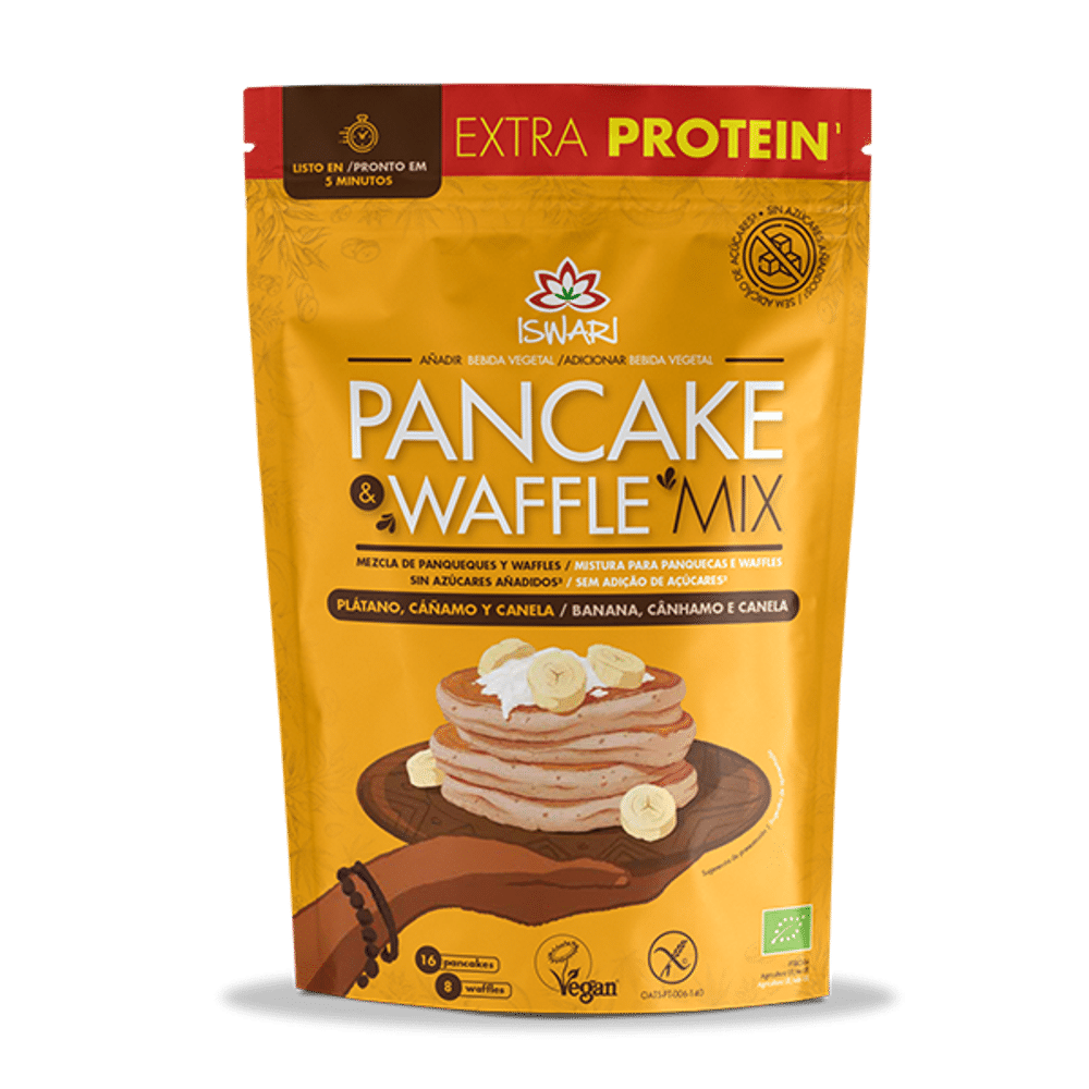 O Pancake & Waffle Mix | Banana, Cânhamo e Canela é a mistura ideal para ter por perto se desejar preparar as suas panquecas ou waffles de forma rápida e descomplicada, para um pequeno-almoço especial, delicioso, mas ainda assim saciante e nutritivo. Através de uma combinação equilibrada de ingredientes integrais e proteínas vegetais, criámos um produto adoçado naturalmente com a banana em pó que harmoniza na perfeição com o aroma da canela! Poderá complementar as suas panquecas e waffles com fruta fresca e a sua manteiga de frutos secos favorita.