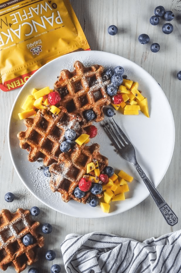 Para uma waffle = 4 colheres de sopa de Pancake & Waffle Mix.