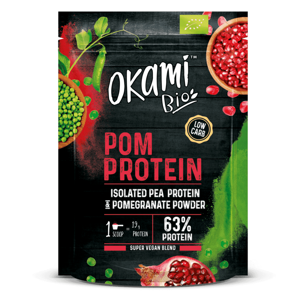 Proteína de ervilha isolada (61%), romã (13%), sementes de chia, canela, e nada mais! Sem aditivos, sem açúcar acrescentado, sem lactose, sem glúten, sem OGM, 100% Natural e Bio.