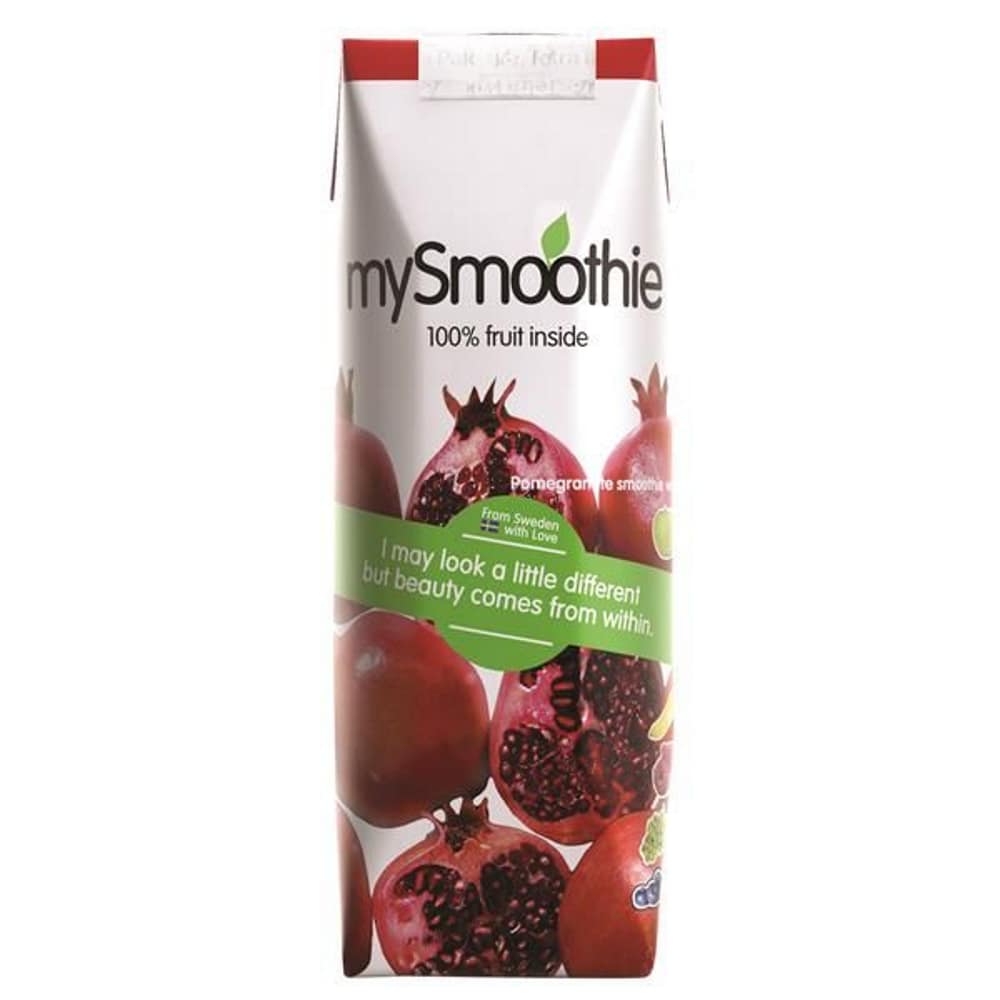 Sumos* de romã 25%, de uva 23% e de maçã 22%, polpa de banana 19% e de framboesa 6%, mirtilos 5%.