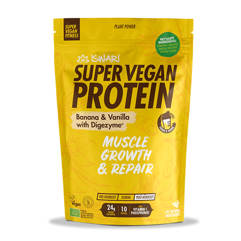 A Super Vegan Protein de Banana e Baunilha foi concebida para maximizar os teus resultados pós-treino. Esta proteína vegetal de ervilha e cânhamo, enriquecida com ingredientes funcionais como camu camu e lucuma, assim como Digezime, o complexo multi-enzimático de cinco enzimas digestivas de origem vegetal, tem o poder de ser o teu melhor companheiro de treino.