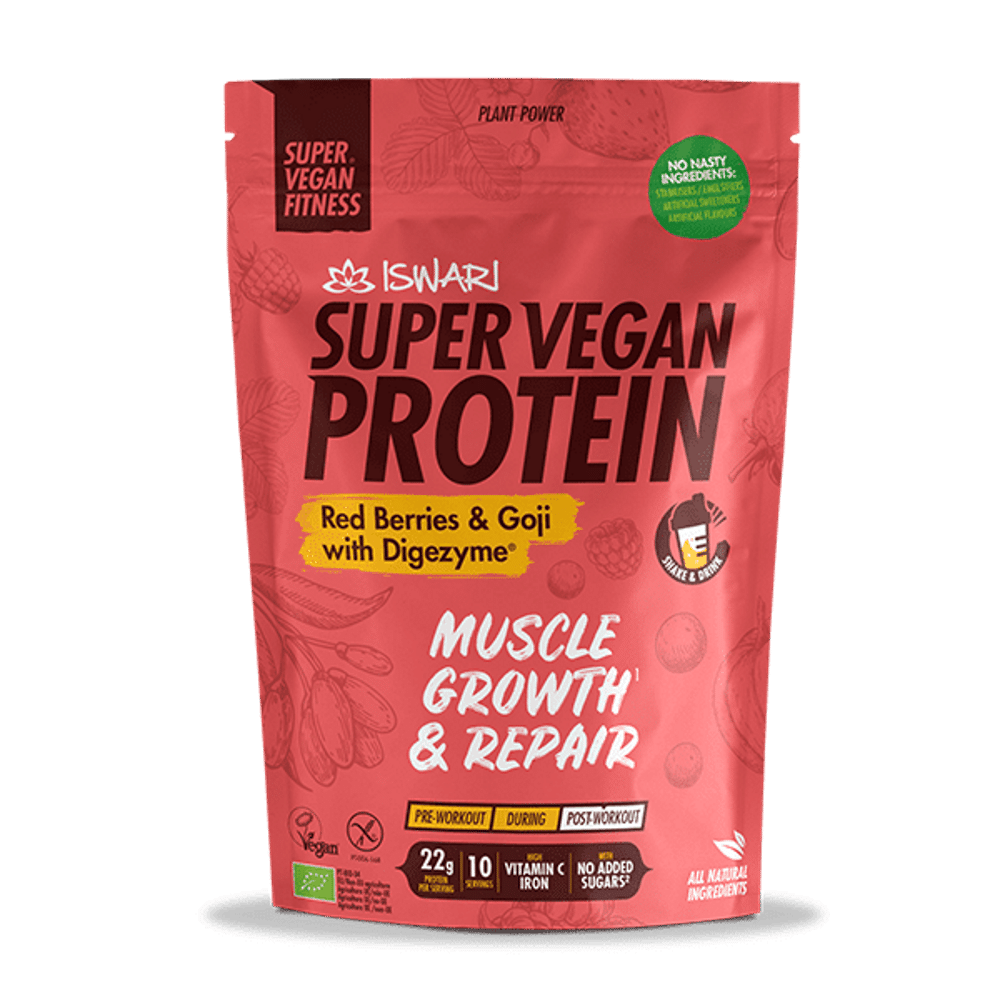 A Super Vegan Fitness Red Berries & Goji oferece 22 gramas de proteína vegetal por dose, com a inclusão das enzimas digestivas Digezyme e sem adição de açúcares (apenas os naturalmente presentes). 100% à base de plantas, só contém ingredientes naturais. Os frutos vermelhos conferem-lhe um sabor delicioso, mas nada enjoativo.