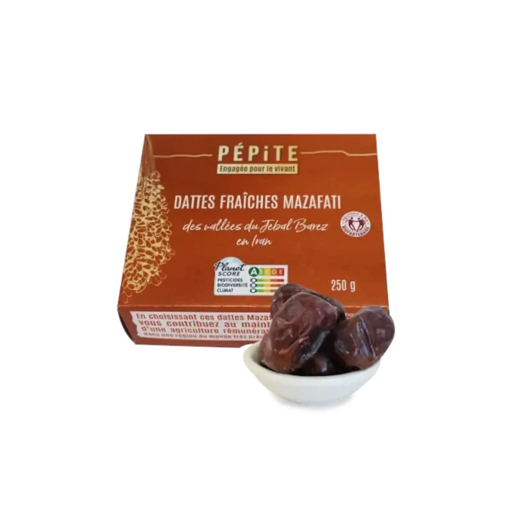 Tâmaras Mazafati, frescas e dos Vales de Jebal Barez, no Irão. Colhidas num estágio antes da maturação completa, técnica que permite obter tâmaras de polpa macia e cremosa de sabor caramelizado.