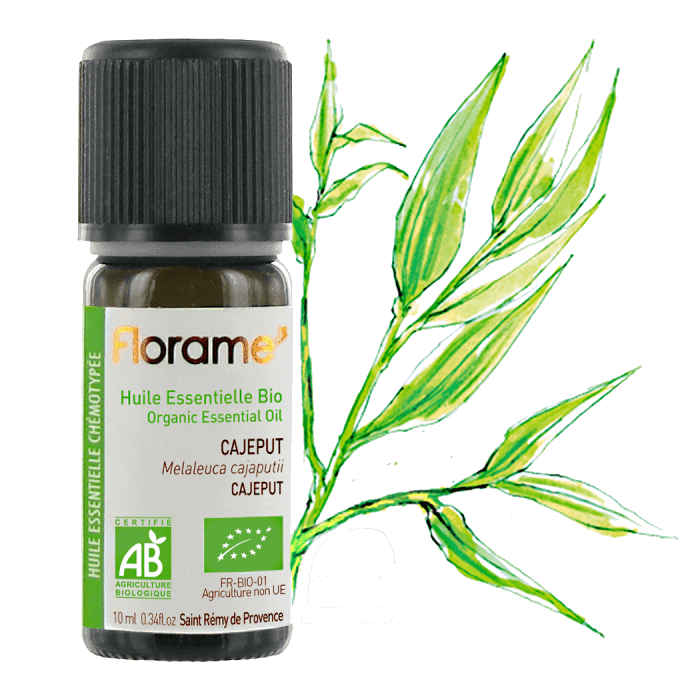 (Melaleuca cajaputii). Proveniente: Ásia / Origem: folha. Lista de ingredientes: óleo essencial de cajeput. Moléculas principais: 1,8-cinéole, α-terpinéol, terpinolène.