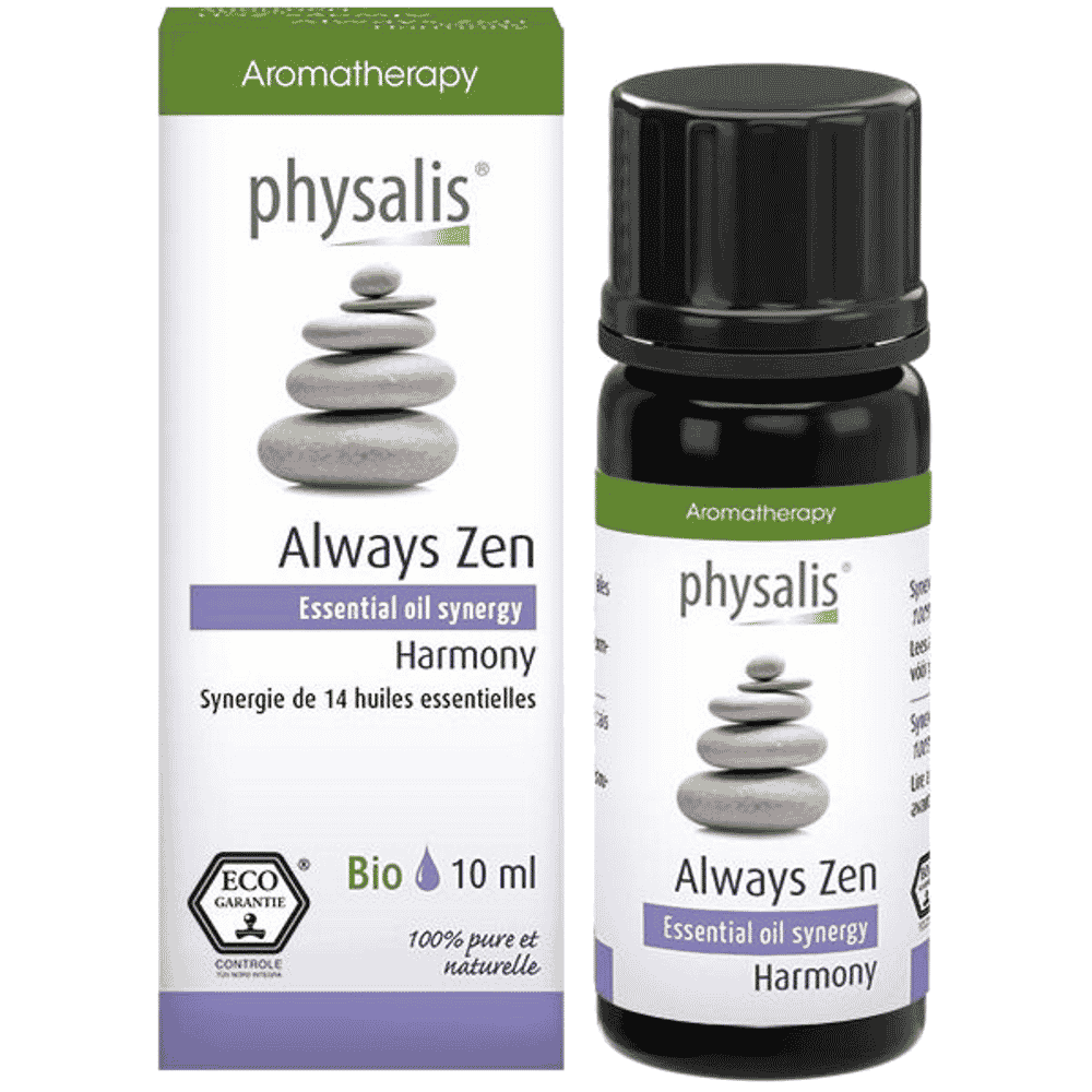 Reencontre a serenidade com o Physalis Always Zen e a sua sinergia de 14 óleos essenciais. Contém, entre outros, Essential Oil Synergy de Alfazema, Lavandin, Tangerina verde, Bergamota, Ravintsara e Manjerona. Promove um estado de calma interior e paz de espírito, permitindo esvaziar a mente.