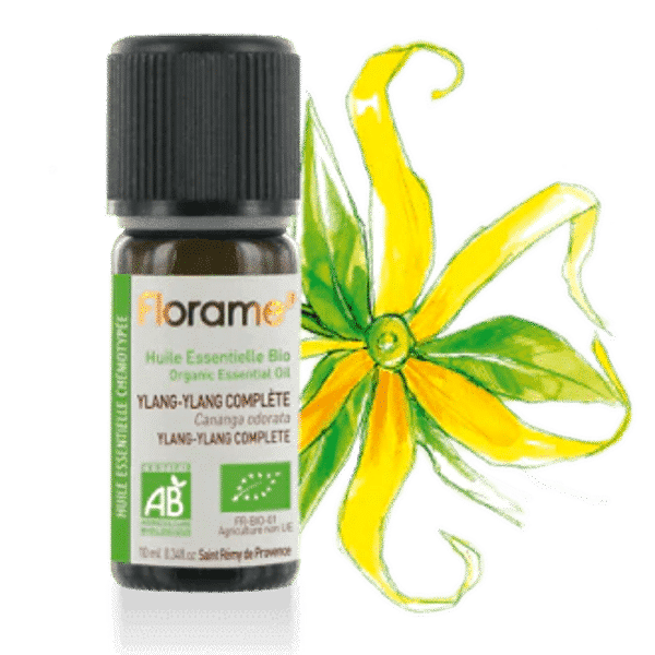 (Cananga odorata).Proveniente: Madagáscar / Origem: Flor;Lista de ingredientes: Óleo essencial de Ylang-ylang complète.Moléculas principais: D-germacrène, β-caryophyllène, acétate de géranyle.