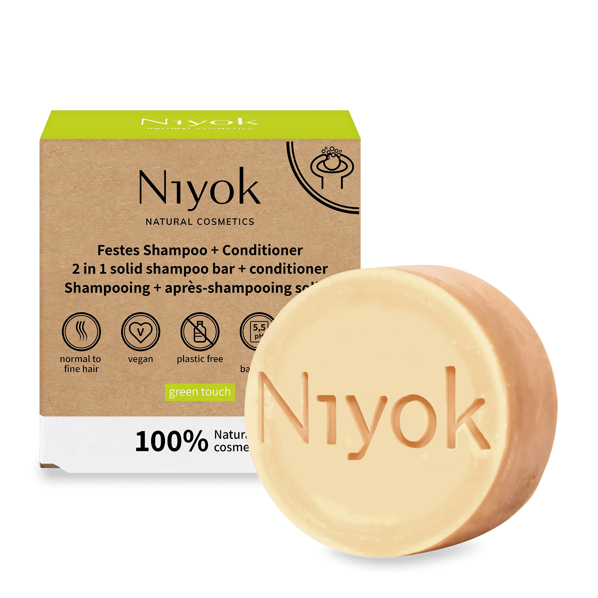 O Champô Amaciador Sólido (2 em 1) Green Touch da Niyok tem um pH equilibrado (5,5) e, por isso, limpa suavemente o cabelo sem secar demasiado o couro cabeludo ou eliminar as bactérias boas da pele. Partes da planta guar são adicionadas como amaciador natural e garantem um cabelo macio e fácil de pentear. Os sulfatos naturais de coco proporcionam bastante espuma, facilitando a aplicação.