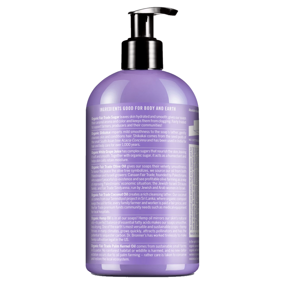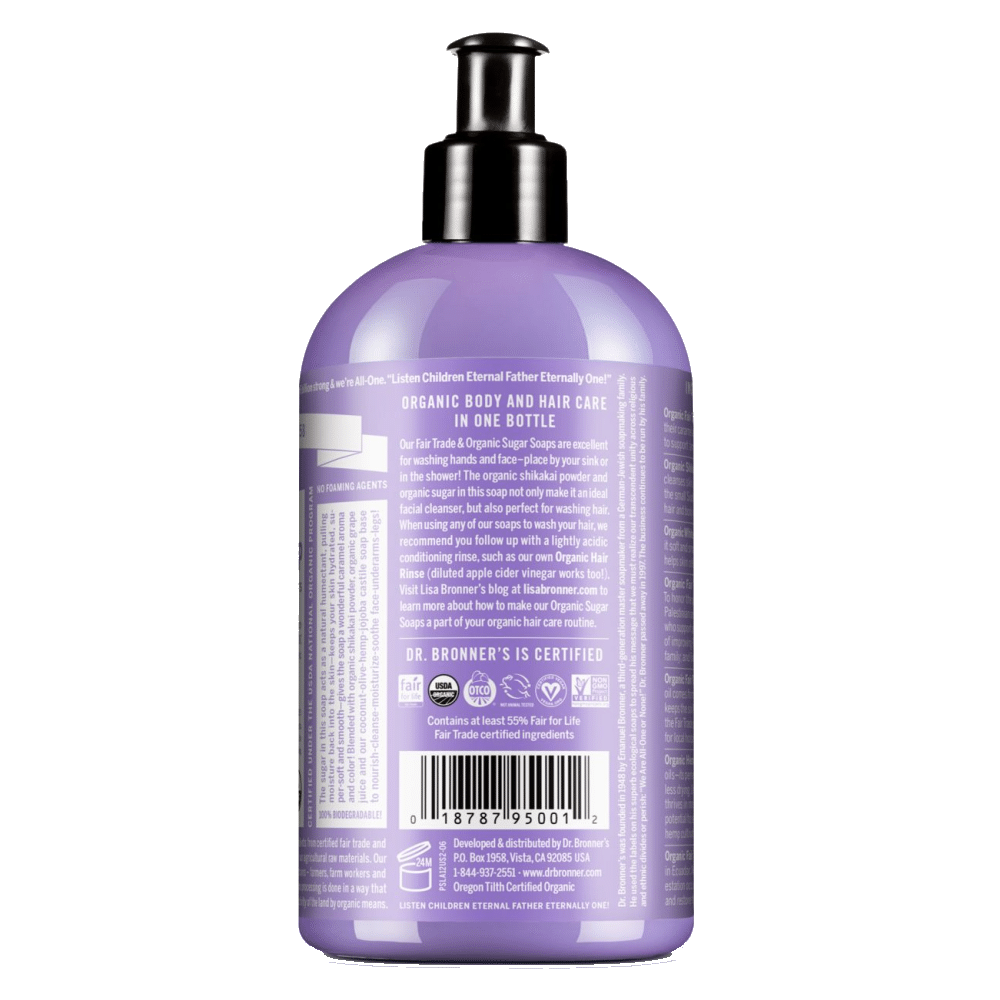 O açúcar biológico e de comércio justo confere aos Sabonetes Biológicos de Açúcar uma cor caramelo rica e um aroma doce. O açúcar é combinado com sumo biológico de uvas brancas para manter a sua pele nutrida, hidratada e suave. Os óleos biológicos de coco, azeite e cânhamo misturam-se para criar uma espuma cremosa característica da Dr. Bronner’s.