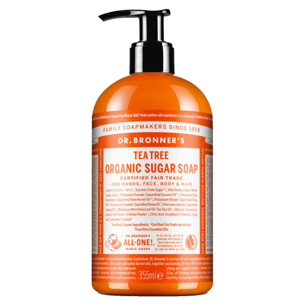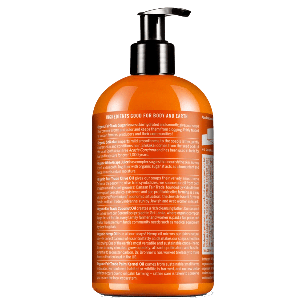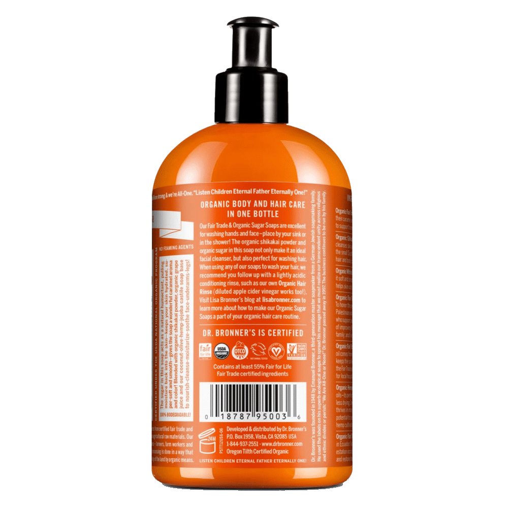 O açúcar biológico e de comércio justo confere aos Sabonetes Biológicos de Açúcar uma cor caramelo rica e um aroma doce. O açúcar é combinado com sumo biológico de uvas brancas para manter a sua pele nutrida, hidratada e suave. Os óleos biológicos de coco, azeite e cânhamo misturam-se para criar uma espuma cremosa característica da Dr. Bronner’s.