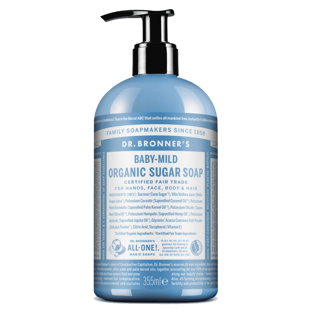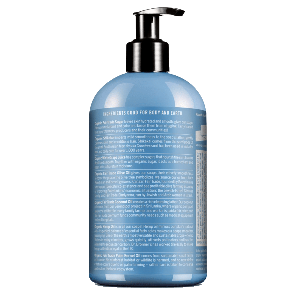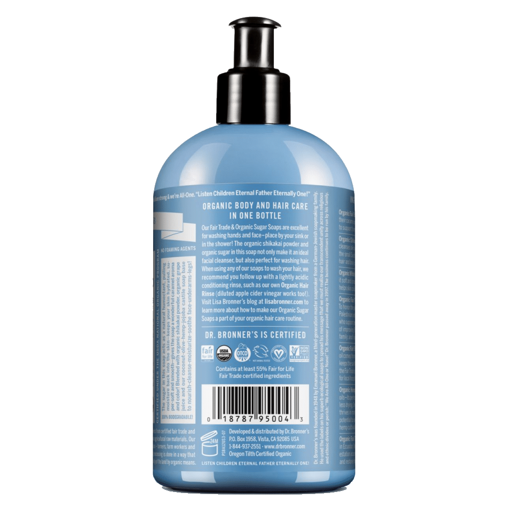 O açúcar biológico e de comércio justo confere aos Sabonetes Biológicos de Açúcar uma cor caramelo rica e um aroma doce. O açúcar é combinado com sumo biológico de uvas brancas para manter a sua pele nutrida, hidratada e suave. Os óleos biológicos de coco, azeite e cânhamo misturam-se para criar uma espuma cremosa característica da Dr. Bronner’s.
