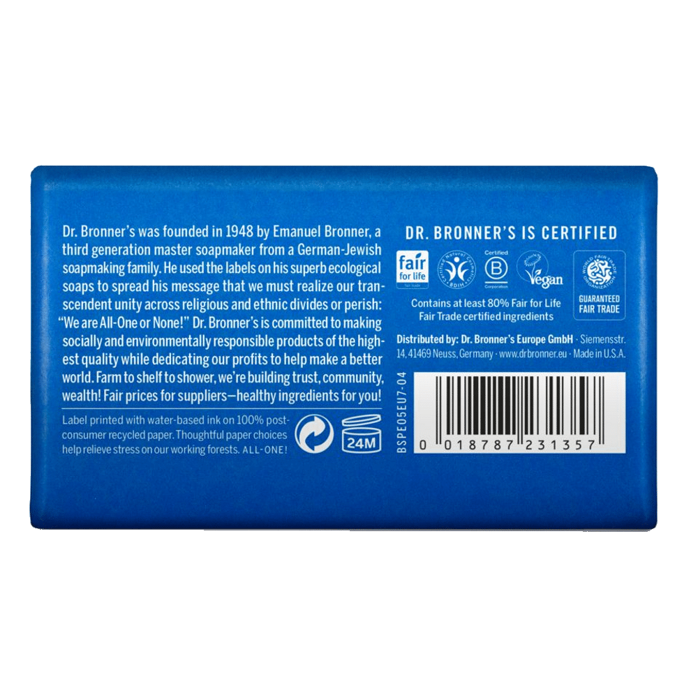 Com uma fórmula simples e ecológica, os sabonetes biológicos Dr.Bronner’s são de origem vegetal e 100% biodegradáveis. São elaborados com ingredientes de comércio justo certificado e óleos biológicos para uma espuma suave que não seca a sua pele.