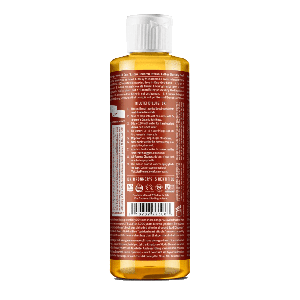 Os sabonetes líquidos Dr. Bronner’s são completamente biodegradáveis e de base vegetal sendo feitos com óleos certificados biológicos e de comércio justo.