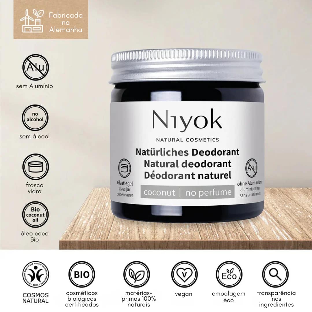 Os desodorizantes da Niyok não mascaram o odor, antes neutralizam-no por ação combinada de 4 ingredientes naturais. O óleo de salva, tem um efeito antitranspirante inibindo a transpiração sem obstruir os poros. O óleo de coco e a manteiga de karité nutrem a pele das axilas e protegem contra a desidratação.
