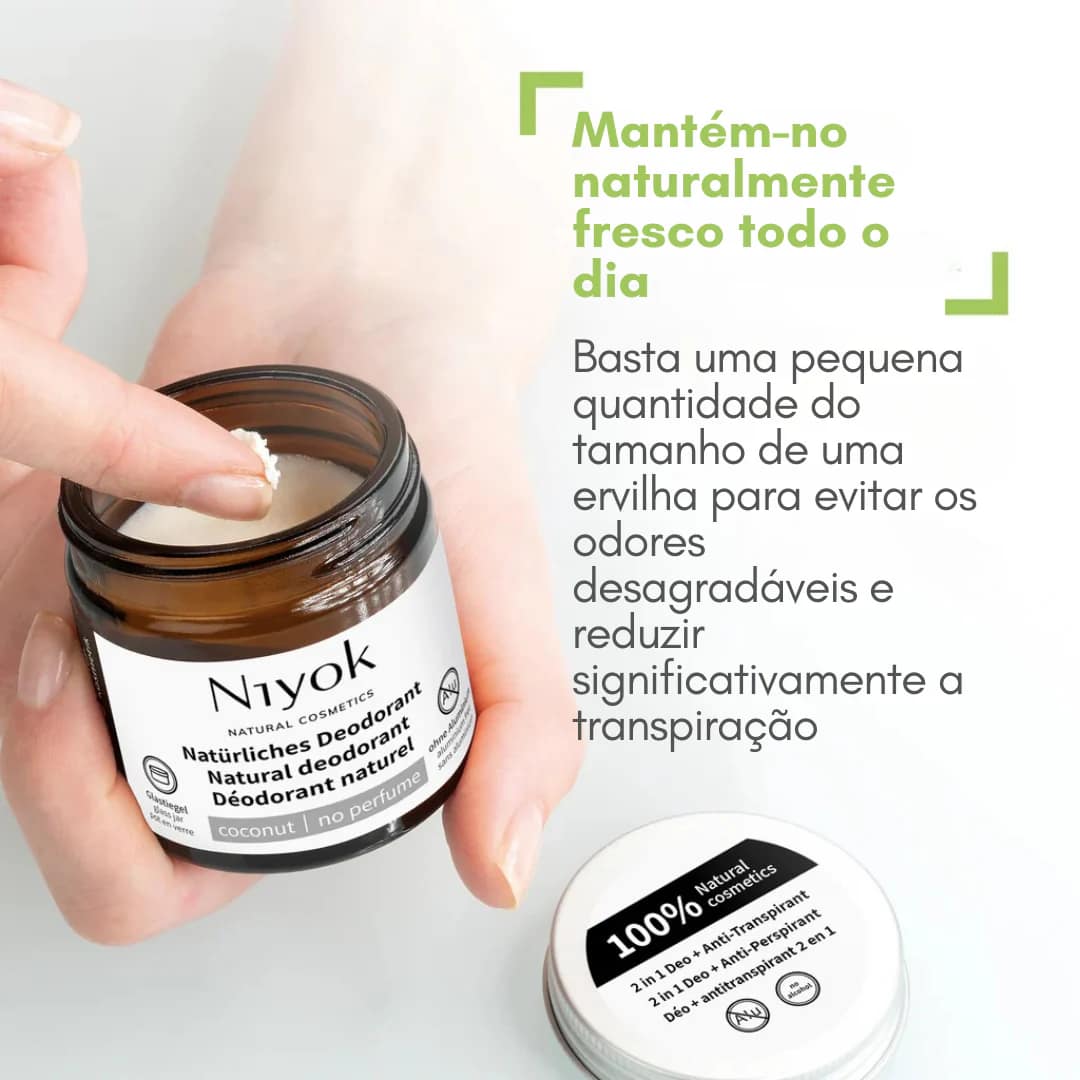 O creme desodorizante Natural Sem perfume da Niyok tem um efeito 2 em 1, desodorizante e antitranspirante.