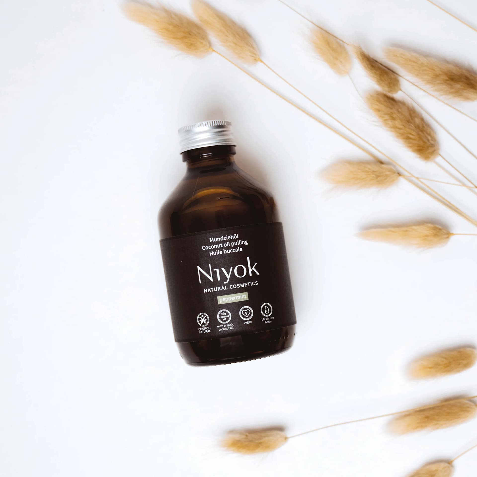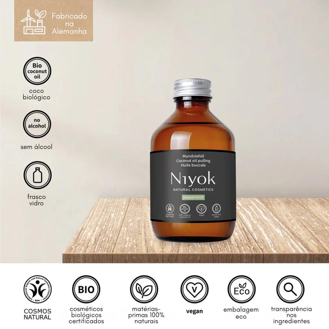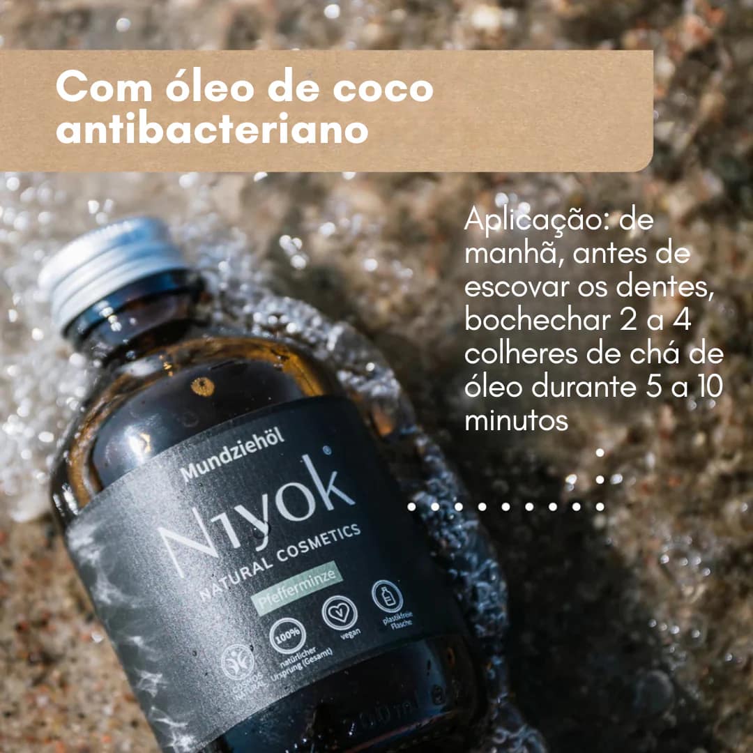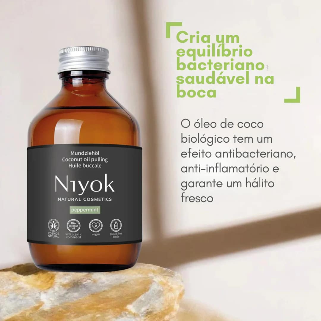 A base do óleo para o Oil Pulling de Óleo de Coco Hortelã-pimenta da Niyok é o óleo de coco biológico de alta qualidade, conhecido pelo seu efeito antibacteriano devido ao alto teor natural de ácido láurico que melhora o equilíbrio bacteriano na boca.