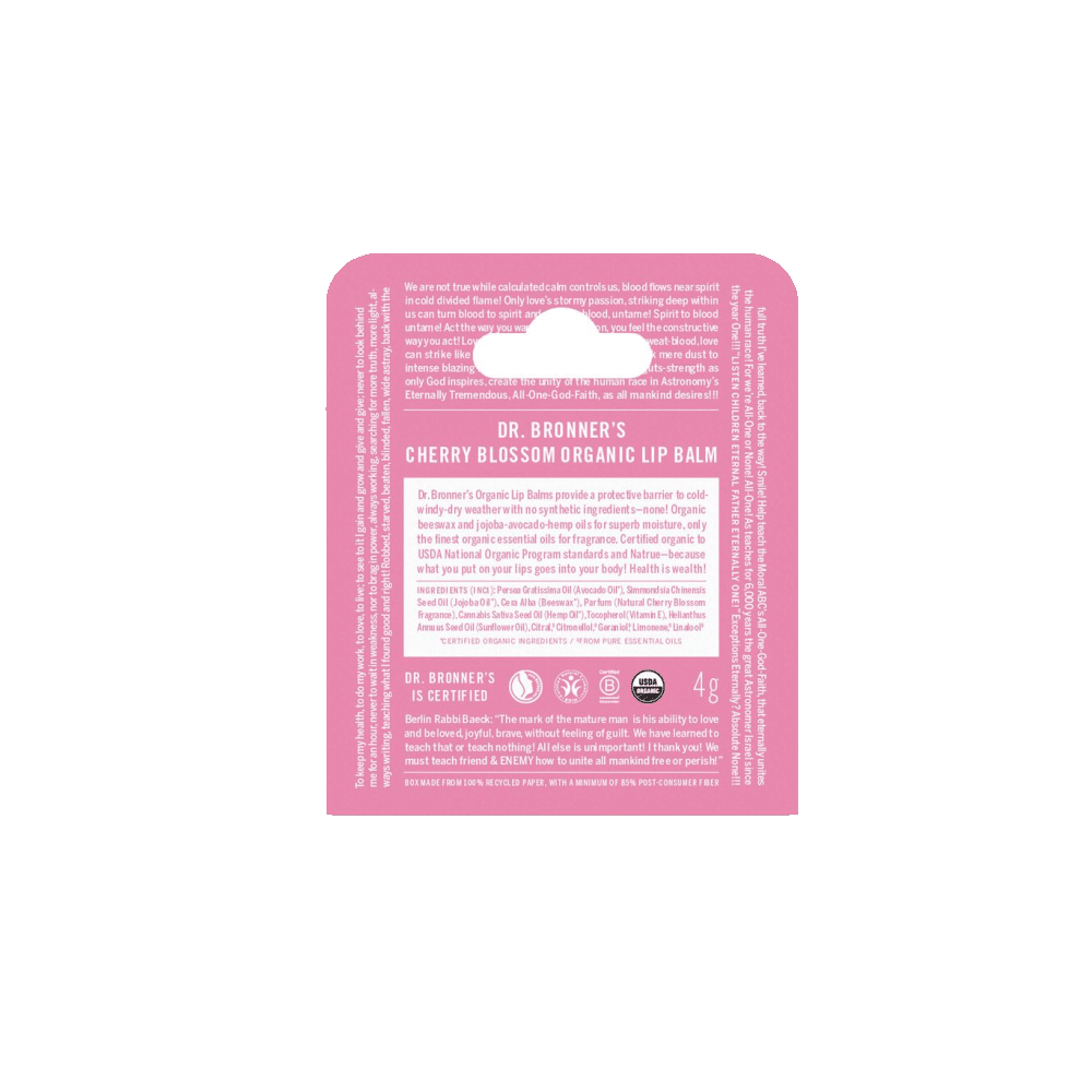 O batom de cieiro da Dr. Bronner’s, produzido com cera de abelha e sem quaisquer ingredientes sintéticos, fornece uma proteção natural contra as agressões externas. Os óleos biológicos de jojoba, de abacate e de cânhamo presentes na sua fórmula, hidratam e suavizam a delicada pele dos lábios.