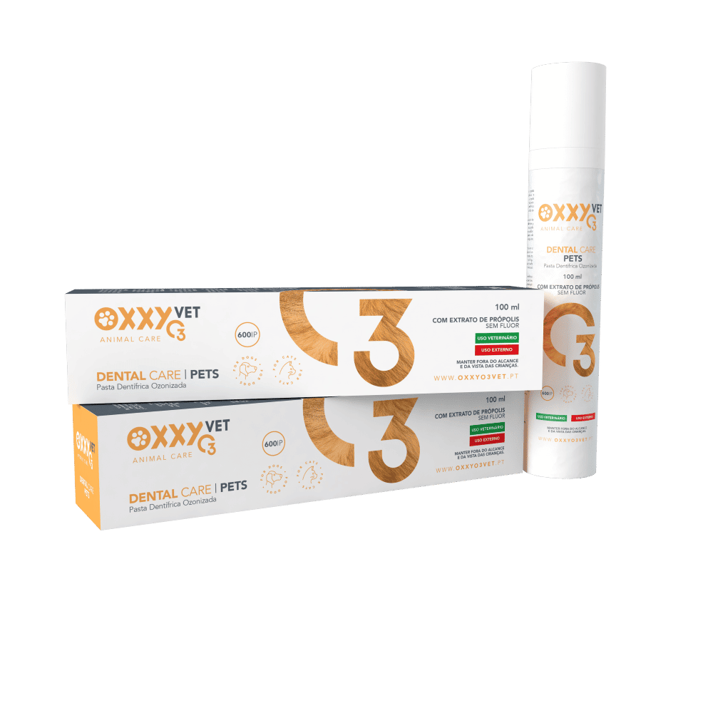 A pasta dentífrica OxxyO3 Vet à base de azeite ozonizado de 600 IP é enriquecida com extrato de Própolis e não contém flúor, nem aromas, ou qualquer outro ingrediente prejudicial à saúde animal. O Ozono tem propriedades antimicrobianas, desinfetantes e protetoras da mucosa oral. Pode ser aplicada de forma clássica com fricção dos dentes por meio de escova ou dedeira ou simplesmente introduzida na cavidade oral. Pode ser deglutida e não requer a utilização de água após aplicação. As propriedades do ozono ajudam a prevenir cáries e afeções das gengivas, assim como a eliminar bactérias causadoras de mau hálito e infeções orais.
