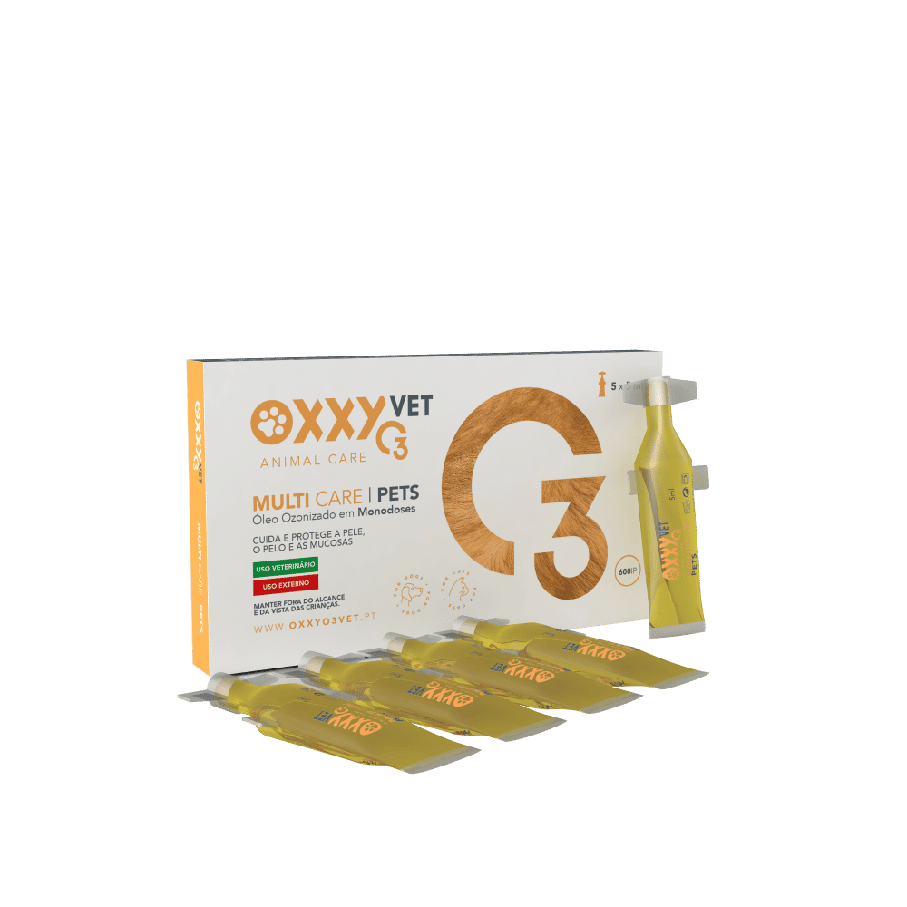 O OxxyO3 Vet Multi Care Pets consiste num azeite ozonizado com 600 IP, numa apresentação versátil em monodoses de 5 mL. A forma prática das monodoses permite o uso preciso em zonas localizadas de cuidado da pele e mucosas. O Ozone Multi Care PETS não é tóxico para os animais. Se o animal lamber o produto, não se preocupe, uma vez que, o azeite ozonizado é 100% orgânico, sem conservantes ou estabilizantes, é uma das opções mais naturais disponíveis. O Ozono tem propriedades desinfetantes, calmantes e protetoras do pelo, pele e mucosas.