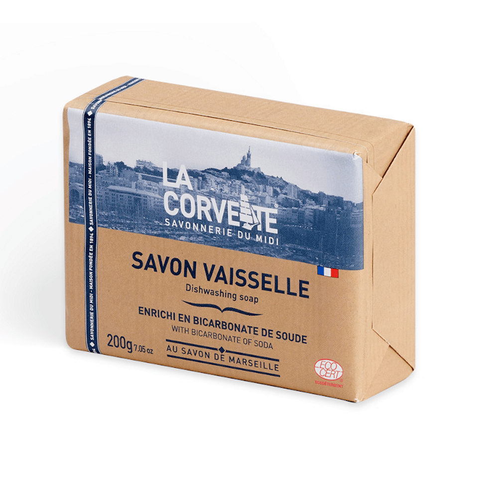 Formulado à base de sabão de Marselha e enriquecido com bicarbonato de sódio, o sabão para loiça La Corvette desengordura e abrilhanta a loiça sem produtos nocivos para o homem e para o ambiente.