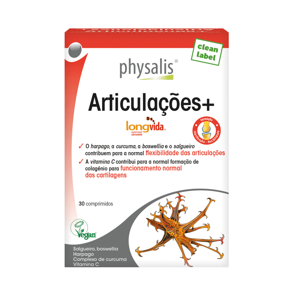 Physalis Articulações+ é um complexo de elevada qualidade, contendo extratos da resina de incenso e harpago. Estas duas substâncias são conhecidas por conterem princípios ativos que contribuem para a flexibilidade das articulações. O extrato de salgueiro suporta esta ação. Adicionou-se extrato de raiz de curcuma, que participa na flexibilidade e saúde das articulações. O complexo de curcuminóides, que tem sido objeto de numerosos estudos e de uma patente (Longvida), é 95 vezes mais absorvido do que o extrato curcumina padrão. A vitamina C contribui para a normal formação de colagénio para funcionamento normal das cartilagens.