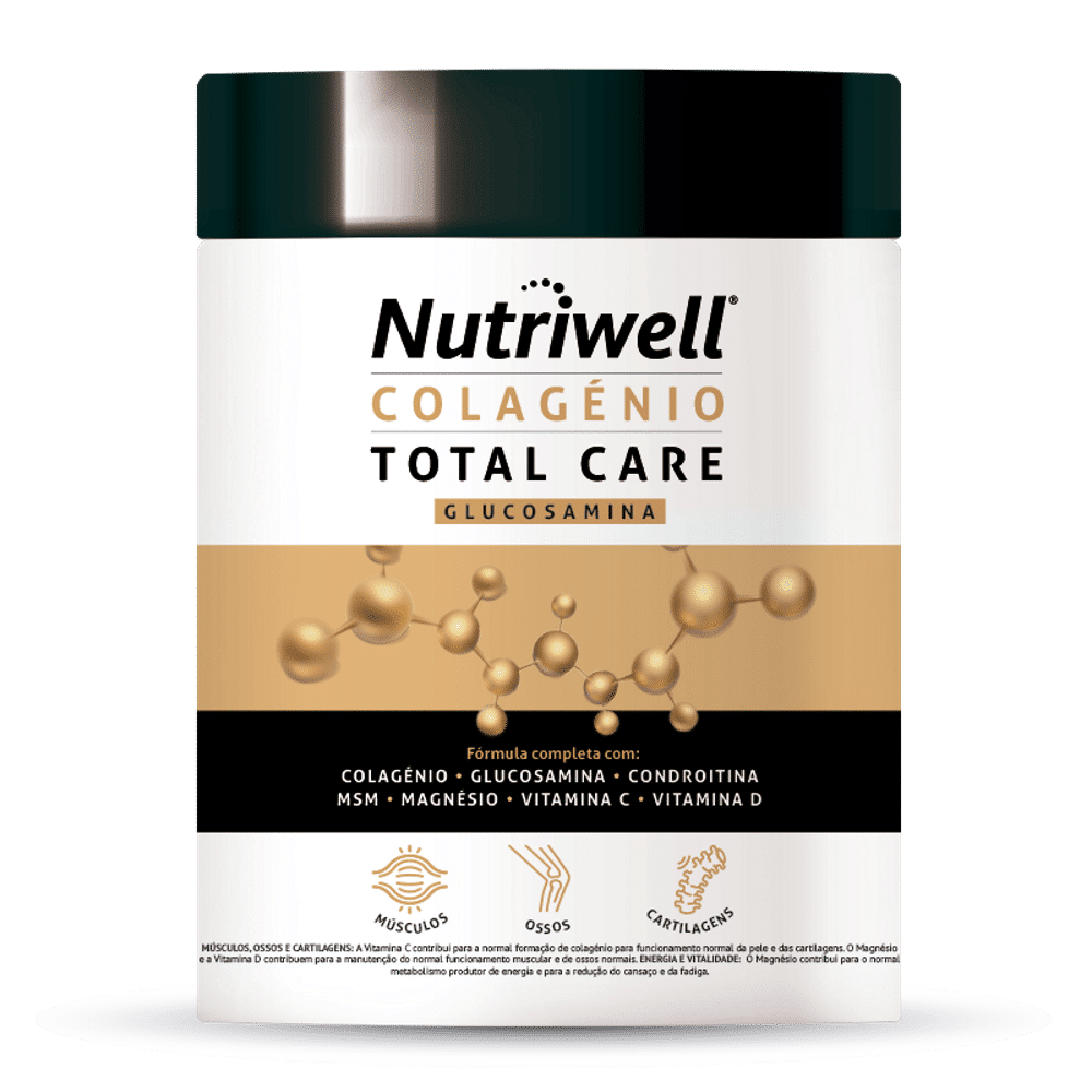Nutriwell Colagénio Total Care é um suplemento alimentar que contém na sua composição Colagénio, Glucosamina, Condroitina, MSM e ainda um complexo de planas como Boswellia e Harpago. Contém ainda Vitaminas e Minerais.