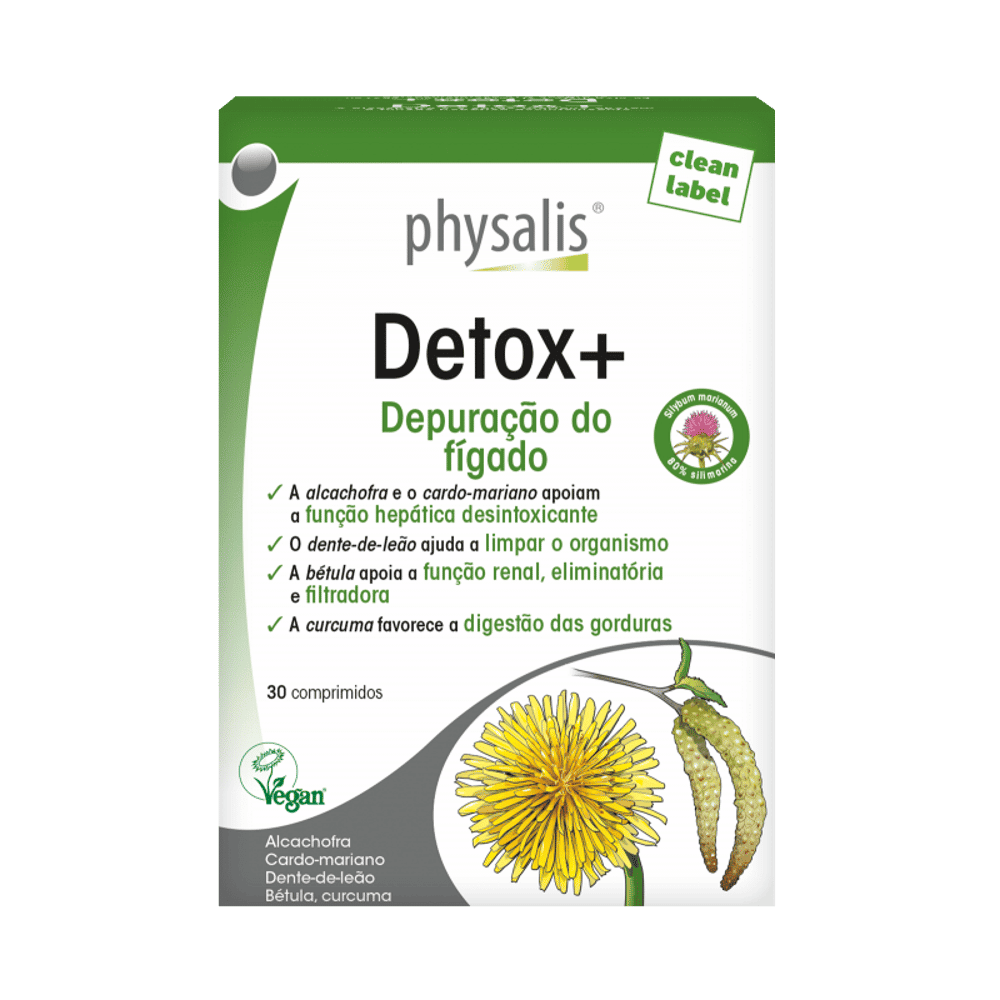 Physalis Detox+ é um complexo sinergético de princípios ativos de plantas como a alcachofra e o cardo-mariano (silimarina) que apoiam o fígado na sua função depurativa e desintoxicante. A bétula apoia a atividade filtradora e eliminadora dos rins. O dente-de-leão contribui para o bom estado geral dos intestinos, pelo seu efeito drenador de bílis e pela sua influência positiva sobre a flora intestinal. O extrato de curcuma contribui igualmente para a manutenção da função hepática e para a correta digestão das gorduras. O complexo de curcumina (Longiva), que foi objeto de numerosos estudos e é uma patente, é cerca de 65 vezes melhor absorvido que a curcumina sob a sua forma tradicional.