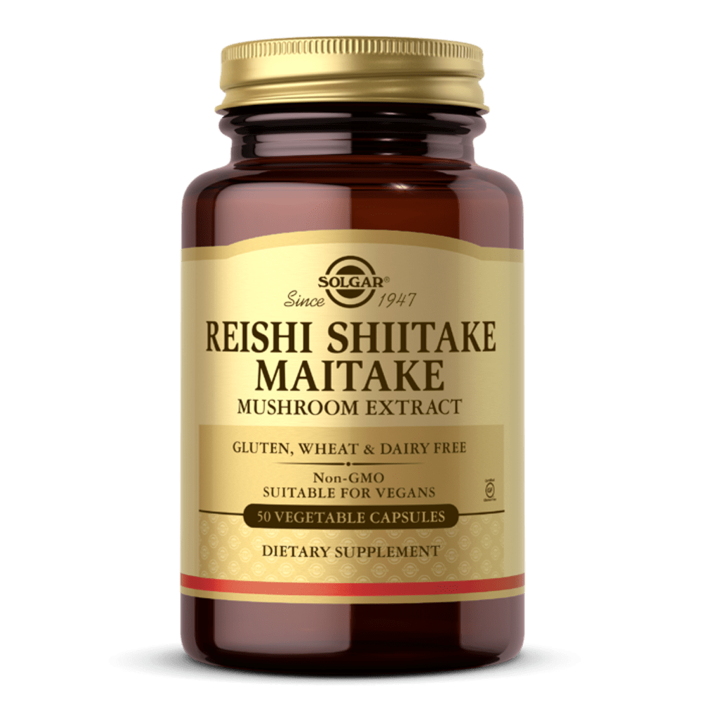 Suplemento alimentar que fornece extratos de cogumelos reishi, shiitake e maitake.