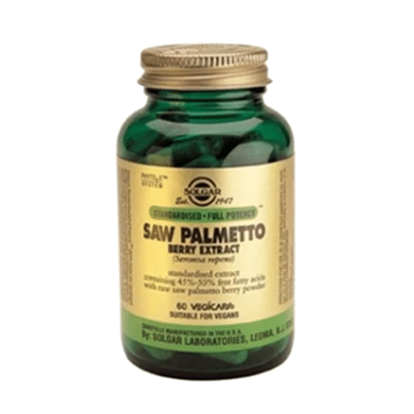 Suplemento alimentar que fornece extrato de bagas de palmeto (Serenoa repens) em cápsulas vegetais.