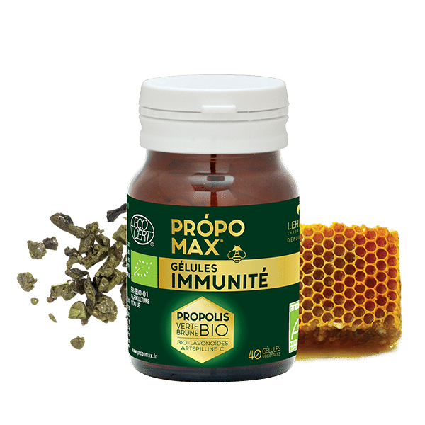 Própomax Cápsulas de Própolis puro 32% da mistura de própolis verde e castanho do Brasil patenteada (EPP-AF) para preparar ou suportar defesas enfraquecidas.