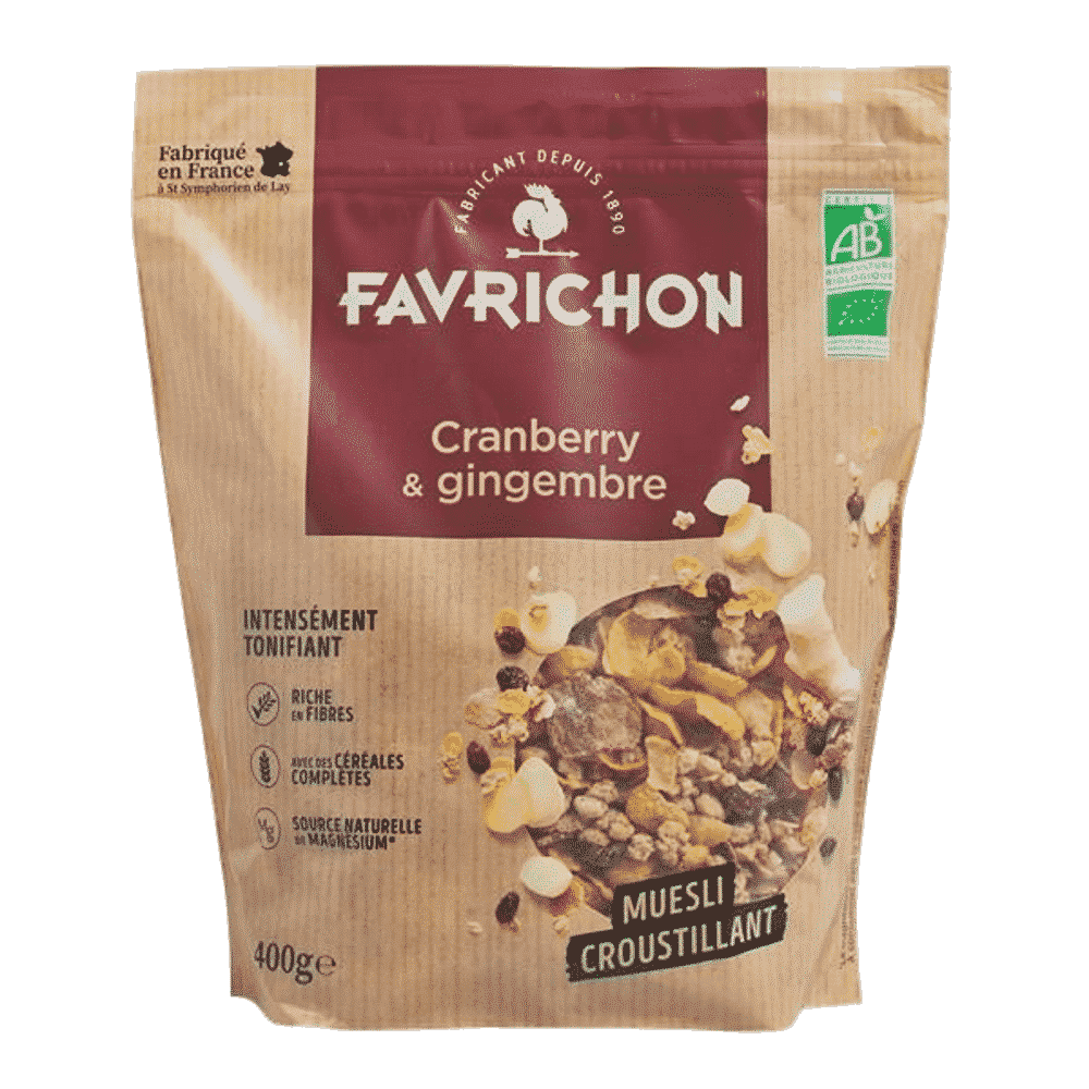 Cereais* 65,2% [flocos de aveia integral* 36,2%, arroz integral*, flocos de milho* (milho*, açúcar de cana*, sal marinho), farinha de trigo espelta integral*], frutos* 11,6% [arandos vermelhos* 6% (arandos vermelhos*, açúcar de cana*, óleo de girassol*), sultanas* (sultanas*, óleo de girassol *)], açúcar de cana* mascavado, óleo de girassol* (girassol*, antioxidante: extrato de alecrim*), xarope de trigo espelta*, fibra de maçã *, gengibre* 0,4%, coentro*, anis estrelado*.